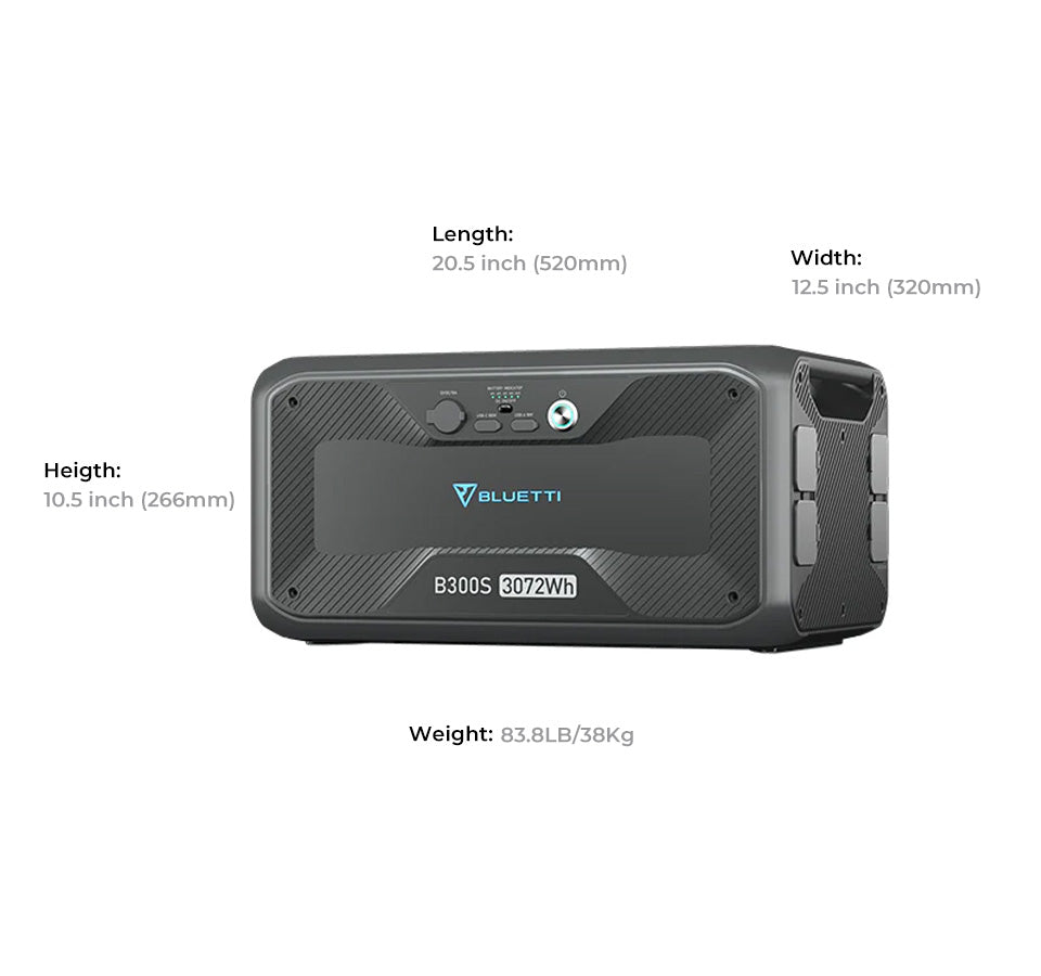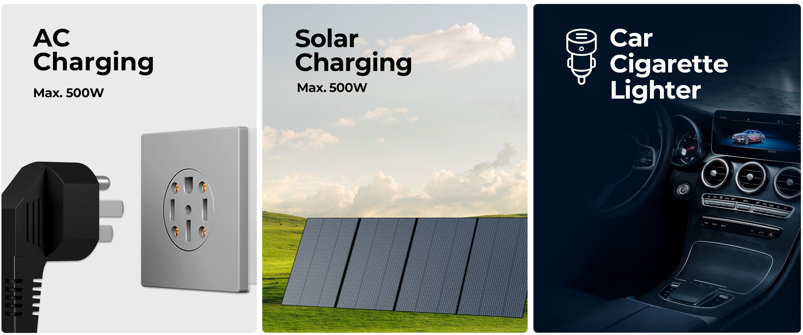 BLUETTI B300S takes up to 500W AC, solar, or car charging. Combine AC with solar or car input, you can top up B300S in less than 3.5-4 hours with a maximum of 1,000W* input rate.