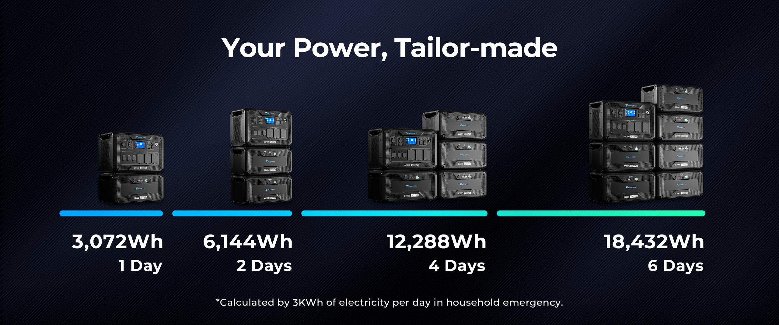 As the companion battery pack to AC500, B300S has a capacity of 3,072Wh and lasts for 3,500+ cycles to 80% of its original capacity. Hook up 6*B300S with AC500, you'll get a powerhouse with 18,432Wh, enough to get you through a severe power outage.