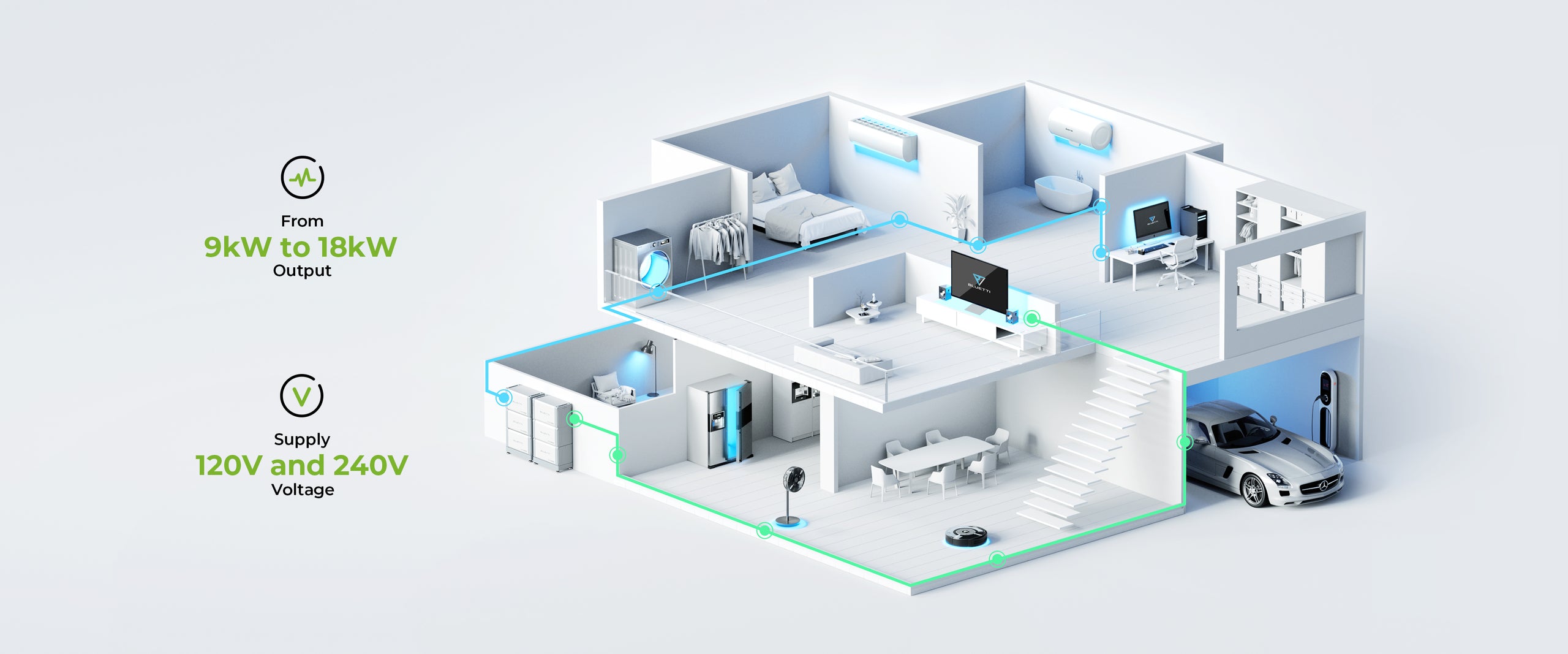 The EP900 has a 9kW inverter that provides either 120V or 240V output options, making it suitable for high-wattage appliances - like power tools in small business and residential scenarios. Combine two EP900 units in parallel to reach as much as 18kW output, enough to power the whole house without any fuss.