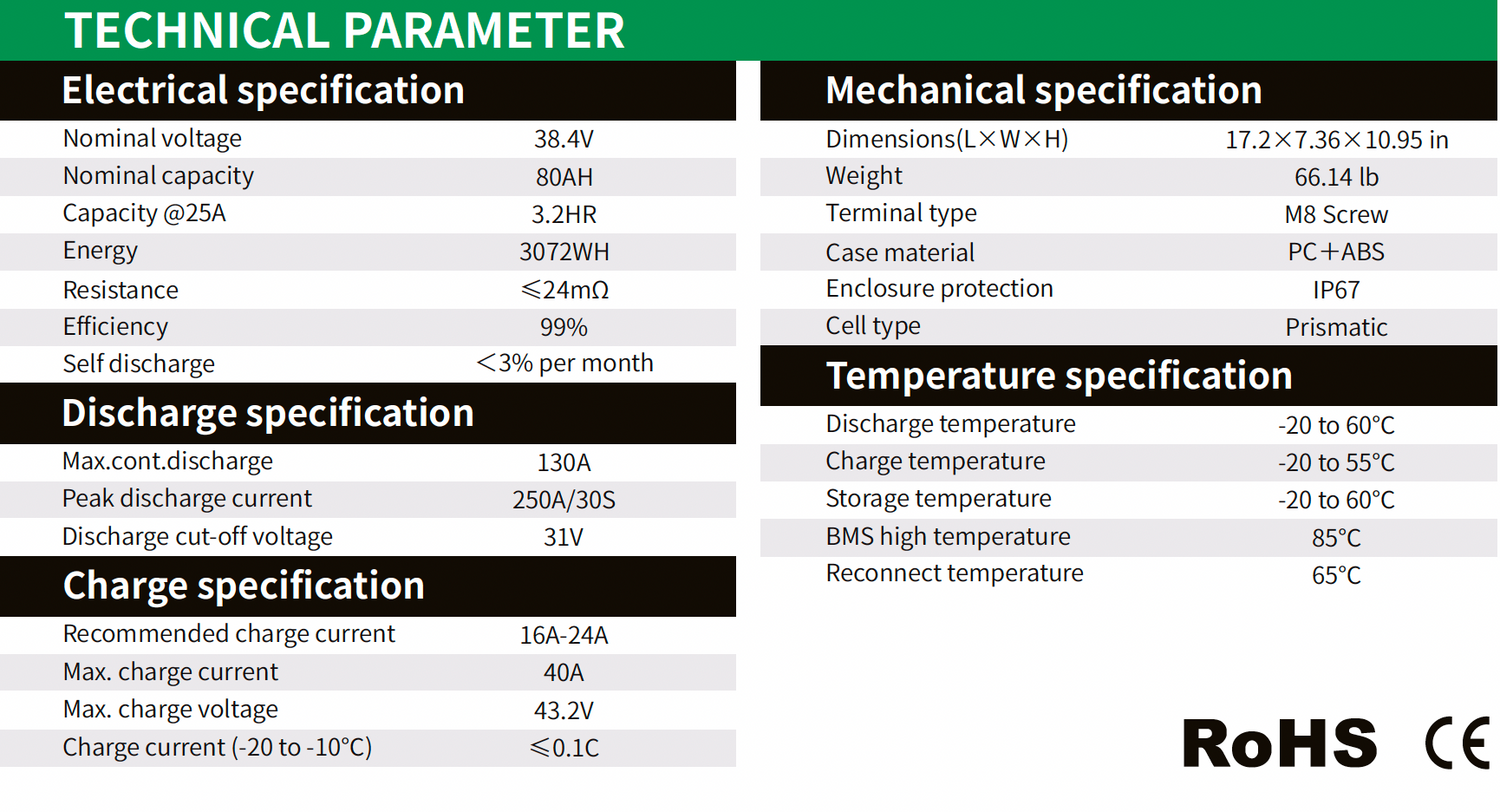 Equipped with a state-of-the-art Battery Management System (BMS), the battery is safeguarded against overcharging, over-discharging, over-current, over-temperature, and short circuits, ensuring long-term safety and durability.